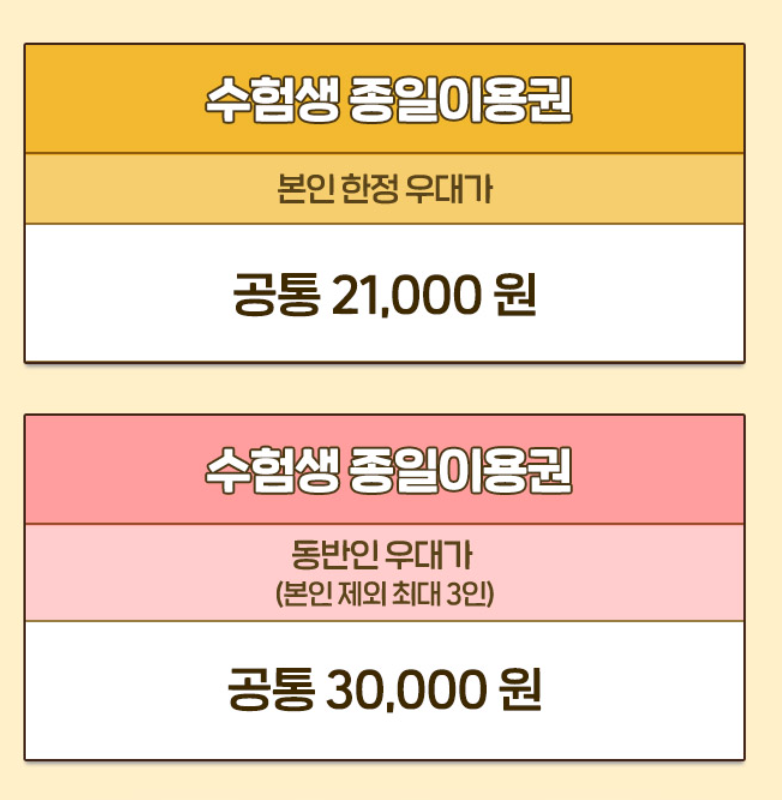 위와 같이 자유이용권에 할인이 적용되며, 수험생뿐만 아니라 동반 1인에게도 혜택이 제공됩니다.